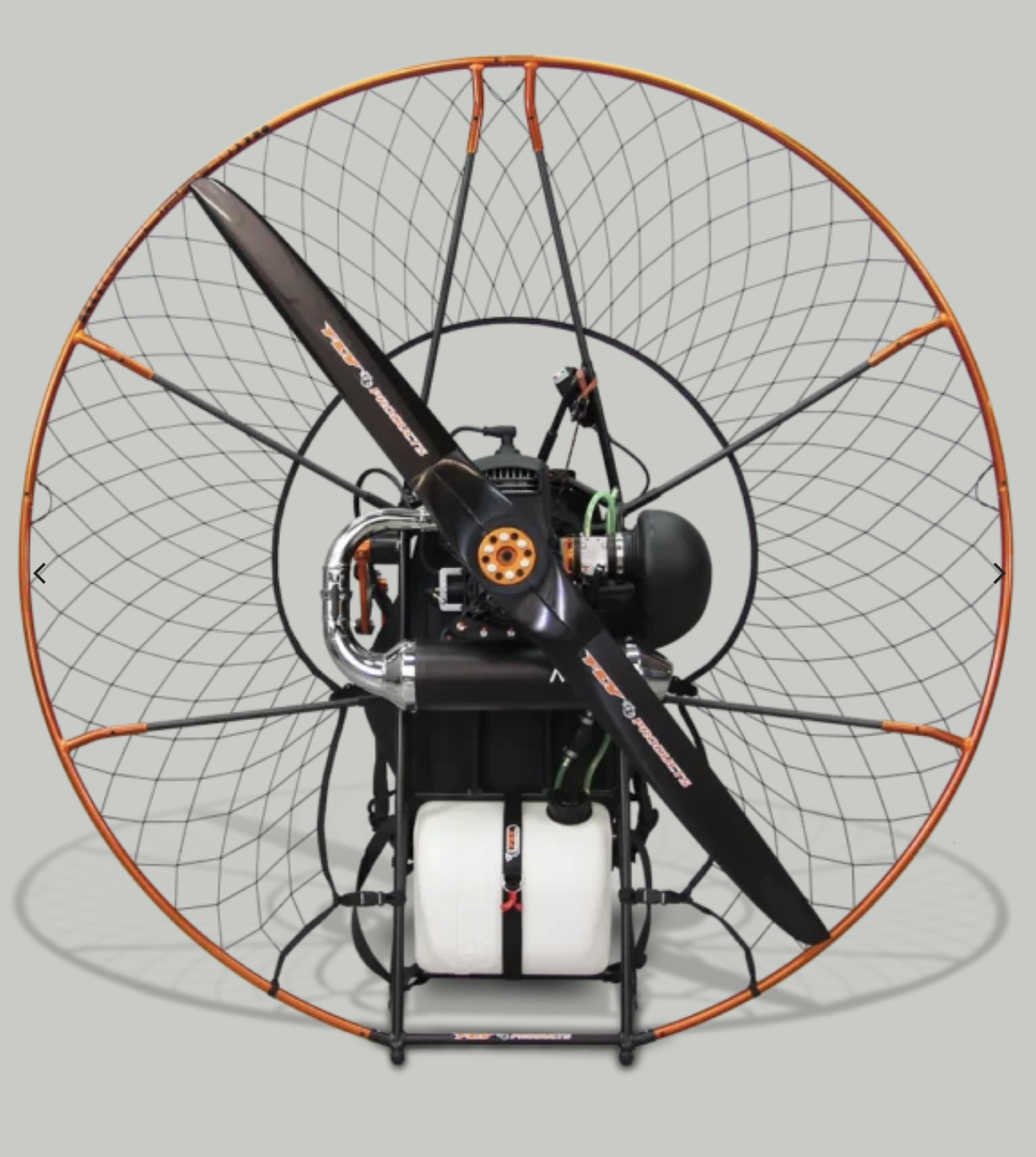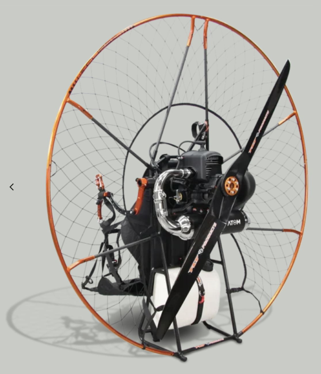 3. Paramotor, je to obvykle malý spaľovací motor s reduktorom, vrtuľou, osadený v ráme s ochranným košom a sedačkou pilota. Váha motora vrátane sedačky bez benzínu by nemala prekračovať cca. 20 kg.